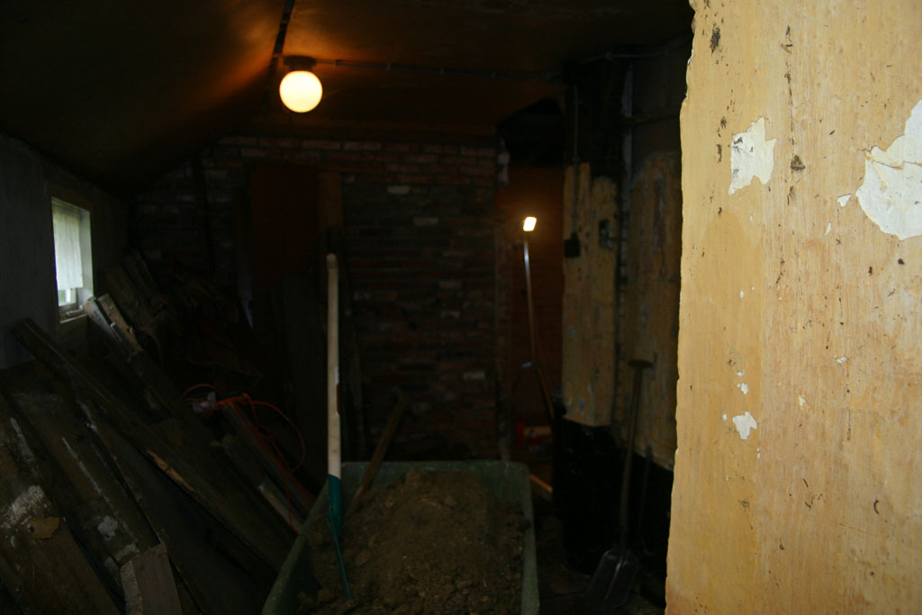 Een foto vanuit de gang achter de bedstedewand richting de tijdelijke badkamer. Hier komt de ook al weer tijdelijke keuken.