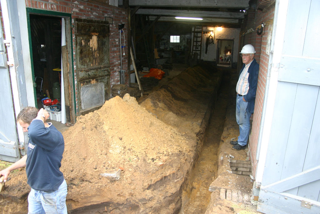 Het riool loopt vanaf de inspectieput onder de deeldeuren door en vervolgens geheel door de deel richting woonhuis.
