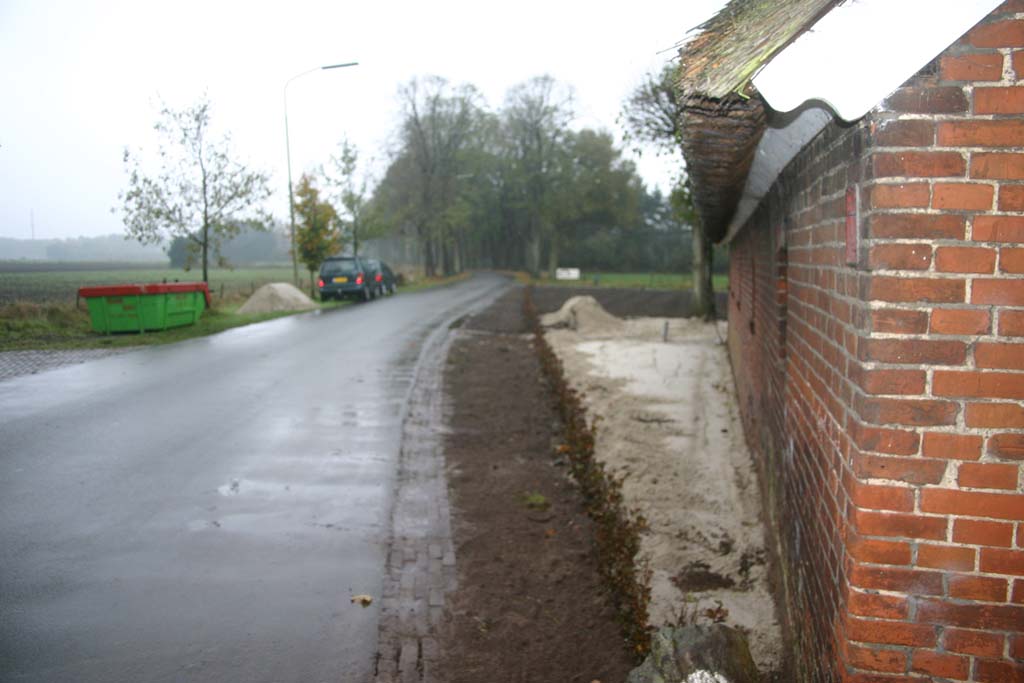 Toch wel een end. De driehoek gaat bestraat worden met flinten en/of klinkers.
