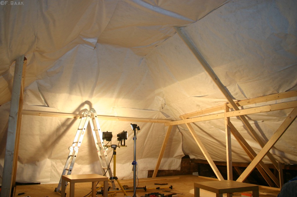 De isolatie wordt afgeschermd van de bovenliggende rietlaag (en de buitenlucht) door een dampdoorlatende folie. Het windverband is hier reeds vervangen door een nieuwe houten constructie. Deze nieuwe constructie vangt zowel krachten in lengte alsook dwars op de kap op. De vakwerkcontructie wordt later betimmerd met 18 mm triplex voor een nog grotere stevigheid. De ruimte achter de betimmering blijft toegankelijk door luiken en dient alleen als bergruimte en toegang tot installaties.