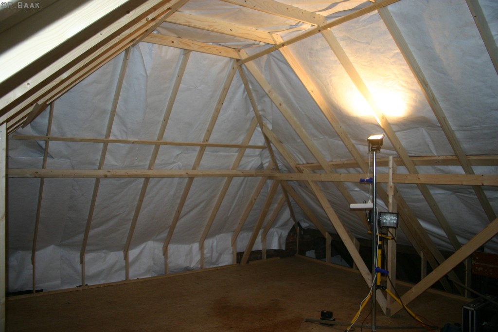 Onder de bestaande sporenkap komt nu een nieuwe sporenkap. De binnenkap staat geheel vrij van de buitenkap. Tussen deze sporen komt 12 cm glaswol isolatie (glaswol vanwege het lage gewicht) met een dampdichte laag.