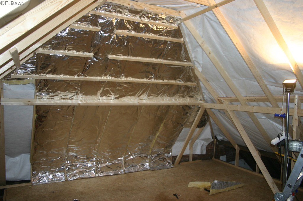 Hier is reeds een deel van de 12 cm glaswol isolatie geplaatst. De naden worden met aluminiumtape afgeplakt om het geheel dampdicht te maken. Daarover komen regels 40cm h.o.h. waarop de gipsplaten geschroefd worden.