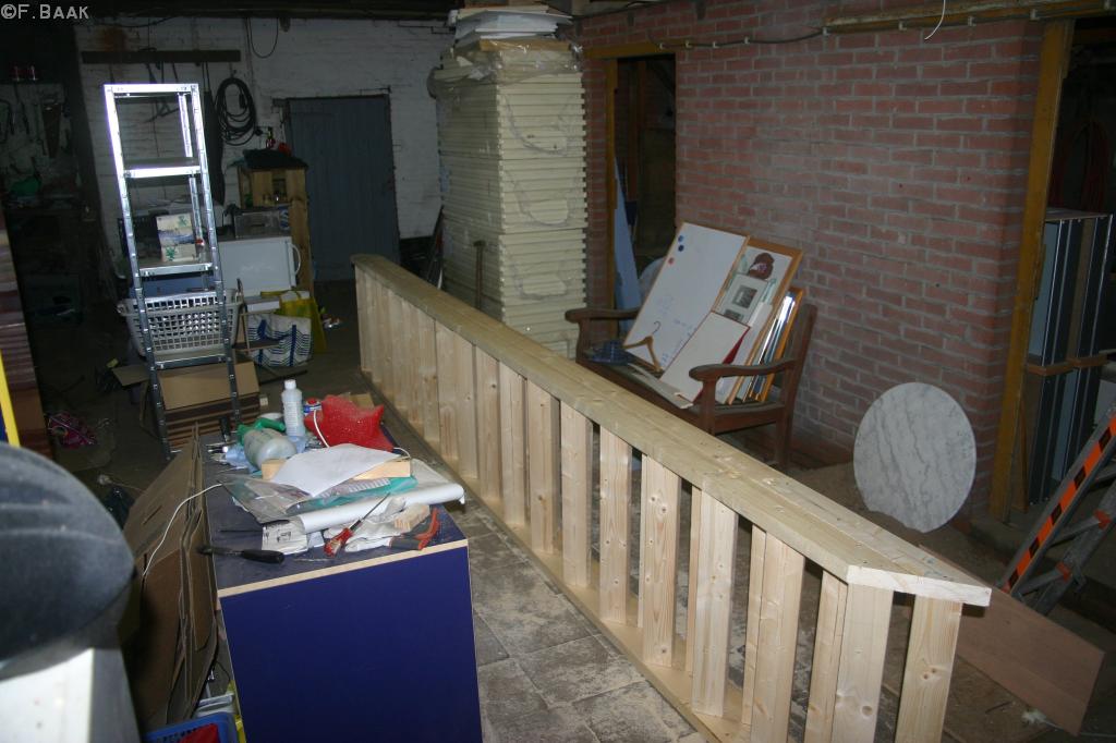 Alles gelijmd en gespijkerd, maar nu... Hoe krijg ik 'm omhoog. De trap is een beetje zwaar.