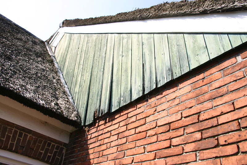 Deze betimmering moet duidelijk hersteld worden. We weten nog niet precies wat we met het kleine raampje in de nok gaan doen. Het is een prachtig gezicht als hier zomers de zon door schijnt dus we willen daar wel een raam.