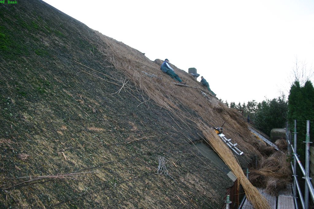 Hoewel het weer nog slecht is beginnen de mannen op vrijdag. Eerst het oude riet er af.