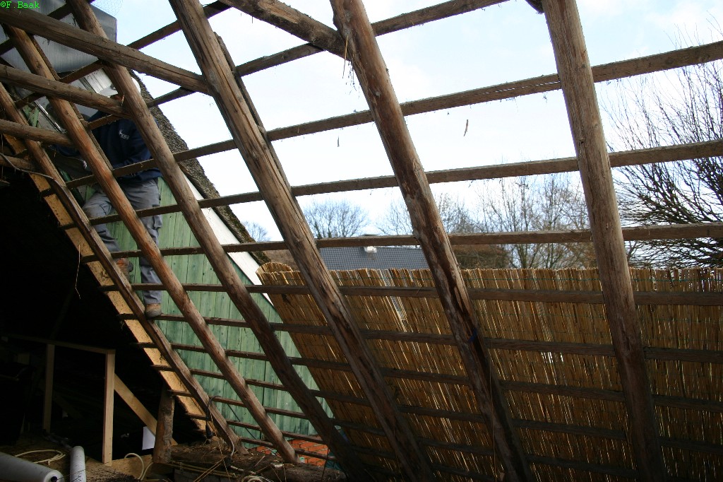 Hier is goed te zien de de spreilaag gedaan wordt met rietmatten ipv los riet. De spreilaag zorgt ervoor dat de pluimen aan de riettoppen niet naar binnen steken en de binnenkant er netjes uitziet.