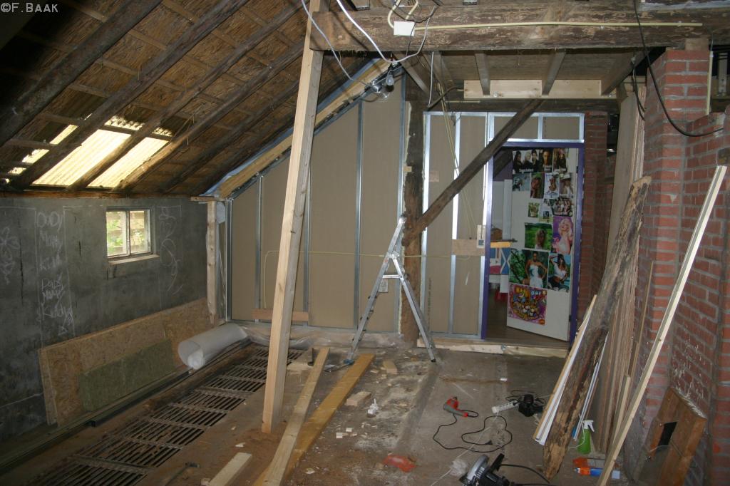 De afstand tussen de twee overige stijlen wordt overbrugd door een kokerbalk. Op de kokerbalk rust de gebintplaat en de gebintligger ter plaatse van de oude stijl.