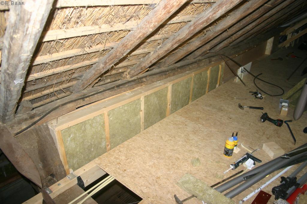 Zicht vanaf de zolder. Voor extra stevigheid worden staanders tussen de balken aangebracht. De ruimte hiertussen wordt opgevuld met steenwol voor verbeterde brandveiligheid en geluidsisolatie. Hieroverheen komt de andere zijde van de beplating.