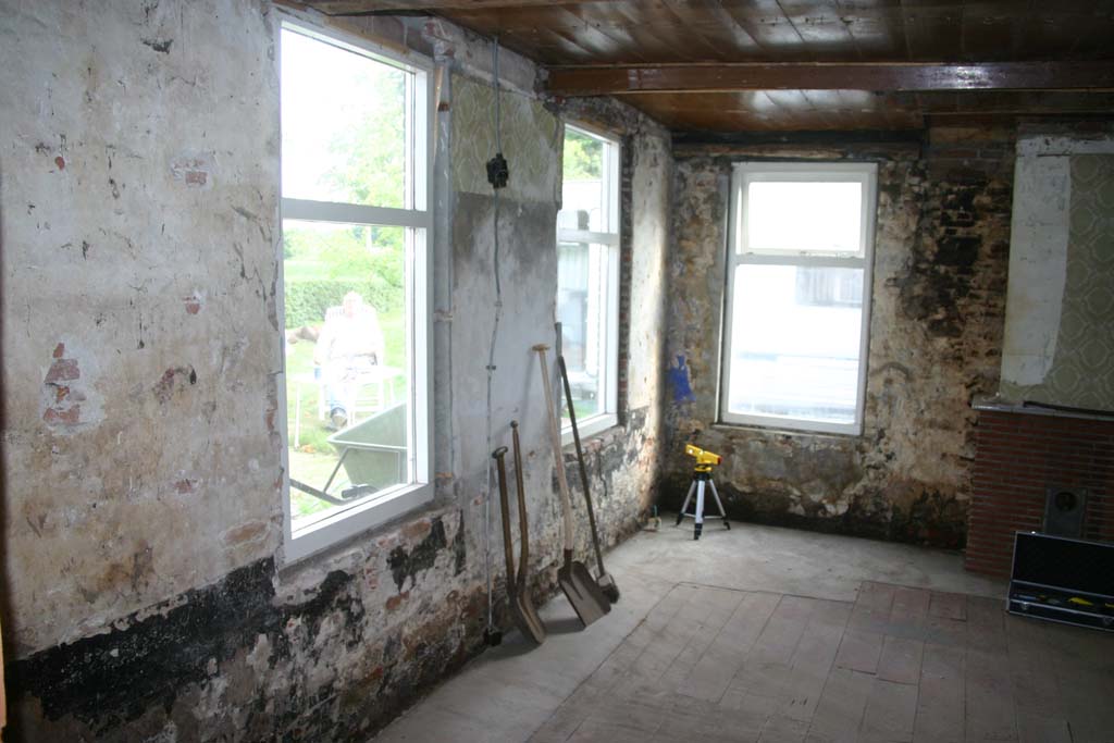 Hier mijn mooie nieuwe laserwaterpas. De vloer leek door de scheve bedstedewand en toegangsdeur scheef af te lopen in de richting van de achterzijde. Na uitmeten bleek de vloer echter nagenoeg waterpas. Hierdoor moesten we weer puin uit de kelder verwijderen.